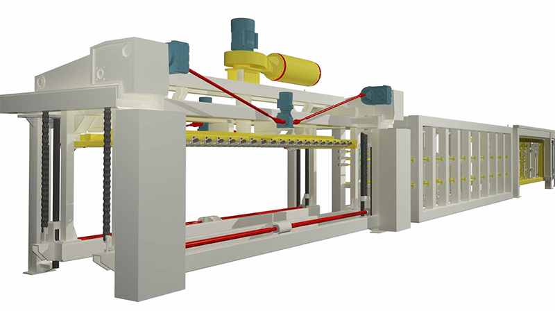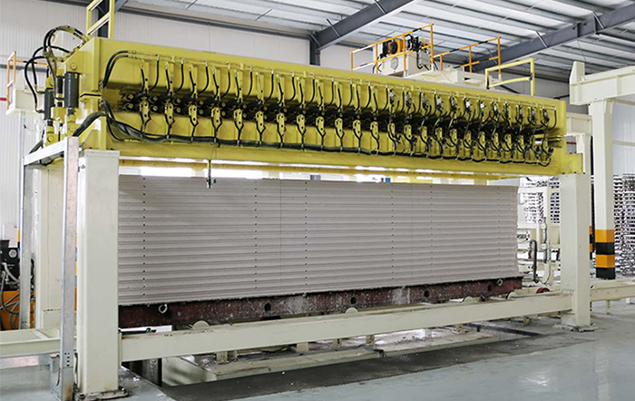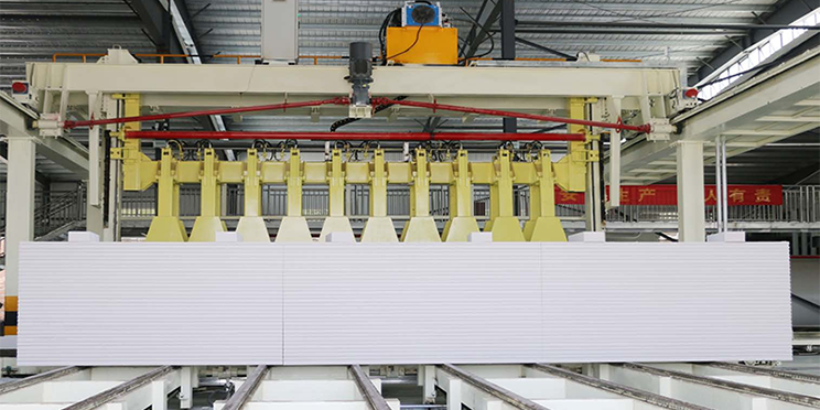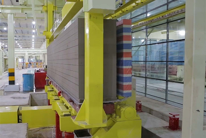 切割機組是加氣板材生產(chǎn)線的核心設備,用于切割不同尺寸的坯體,滿足超精確砌塊和板材的切割精度要求,生產(chǎn)板材時配合板材進給刮刀,調(diào)節(jié)側(cè)面切割機的刮刀行程,可以滿足不同尺寸制品的混合切割。