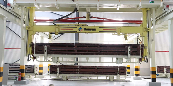 空翻脫模機用于抓取模箱翻轉(zhuǎn) 90°,側(cè)立在切割小車上進行切割;由行走部分與吊具組成,吊具升降、開鎖及翻轉(zhuǎn)均采用液壓驅(qū)動;模具開鎖采用液壓缸直開式結(jié)構,鎖緊臂旋轉(zhuǎn) 90°,具有開合迅速穩(wěn)定等特點;模具抓鉤采用直抓式結(jié)構,具有液壓鎖定及機械自鎖,確保吊運的安全。