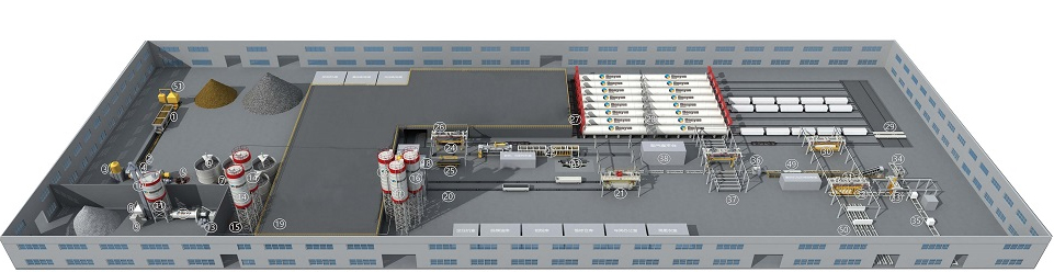 3、澆注工藝:采用固定澆注,模具移動到澆注攪拌機下方,接受澆注后,自動進入能夠控制濕度和溫度的養(yǎng)護室,加速胚體的硬化。